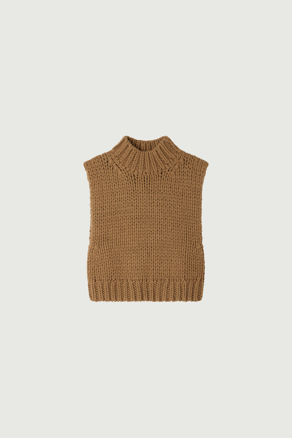 BRETT is a sleeveless wool jumper, perfect for layering. Its chunky knit gives it a hand-knit effect. Made from pure virgin wool, it can be worn directly on the skin or layered to add warmth to an outfit. Its camel colour pairs easily with everything.